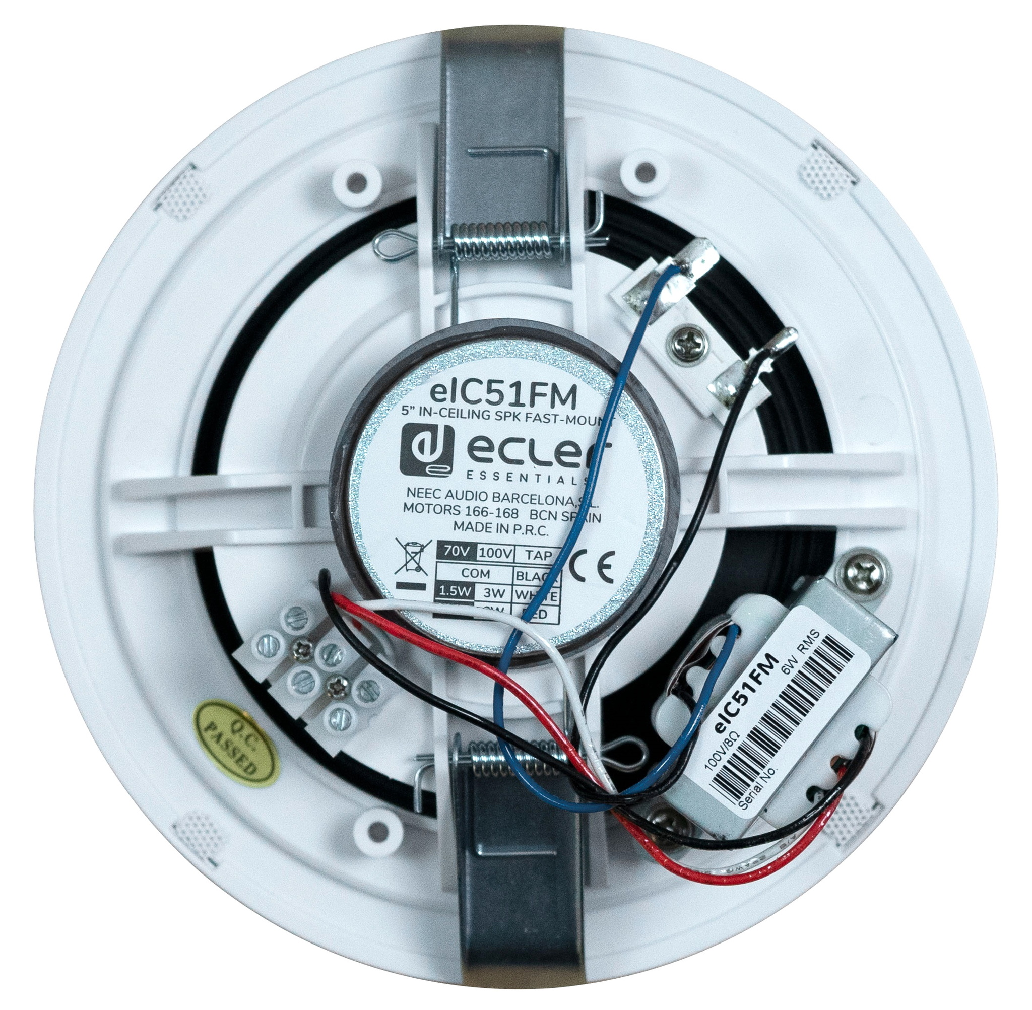 ECLER eIC51FM – широкополосная встраиваемая акустическая система eIC серии, имеющая отличные звуковые характеристики и весьма привлекательный дизайн. Она оснащена 4.5" полнодиапазонным динамиком, который обеспечивает 6 Вт мощности (RMS) при низкоомном подключении 8 Ом. Дополнительно предусмотрен высоковольтный трансформатор 70 / 100 В с отводами выбора уровня мощности: 100 В - 3/6 Вт, 70 В - 3/1.5 Вт.