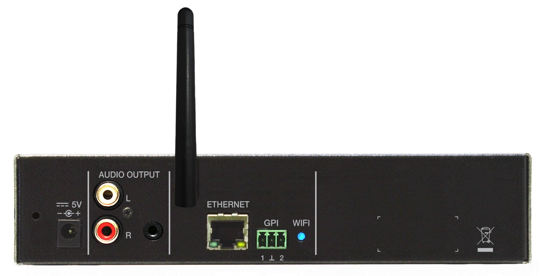 - Ethernet (RJ45) для интеграции в сеть EclerNet, TP-NET управления, приема потокового аудио через интернет;