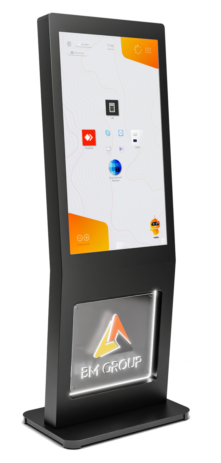 Яркий сенсорный дисплей с диагональю 43 дюйма поддерживает до 20 касаний одновременно. В нижней части корпуса есть ниша с подсветкой для размещения вашего логотипа.