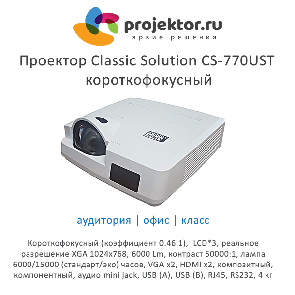 Проектор Classic Solution CS-770UST хорошо подходит как проектор для школы и полностью локализован для учебных заведений РБ. Встроенное меню и инструкция пользователя на русском языке, надписи над кнопками управления на корпусе тоже на русском.